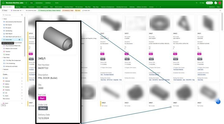 With our newfound knowledge of what was possible we set out to get paperless parts talking to Airtable. Using Zapier it was shocking how easy it was to get this setup. Within an hour or two we had data flowing. Part numbers, due dates, thumbnails, links to drawings , etc all getting put into Airtable whenever we got an order, automatically, it was amazing.